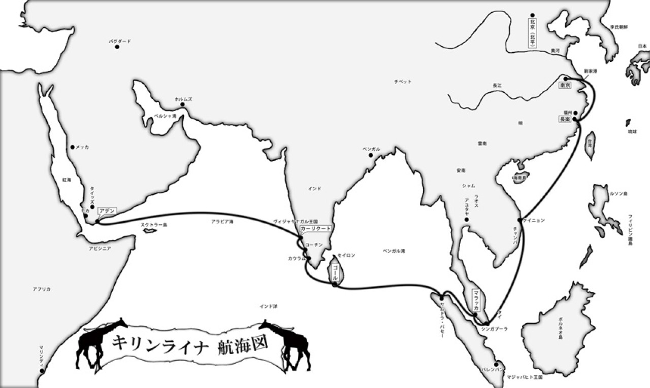 史上初のキリン遠洋輸送を完遂すべく、アラビアの貿易港市アデンを出港した明の鄭和艦隊分遣隊は、アラビア海を横航し、インド、セイロン、ベンガル湾を越えて、同盟国のマラッカ王国に到着した。