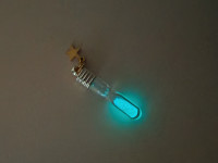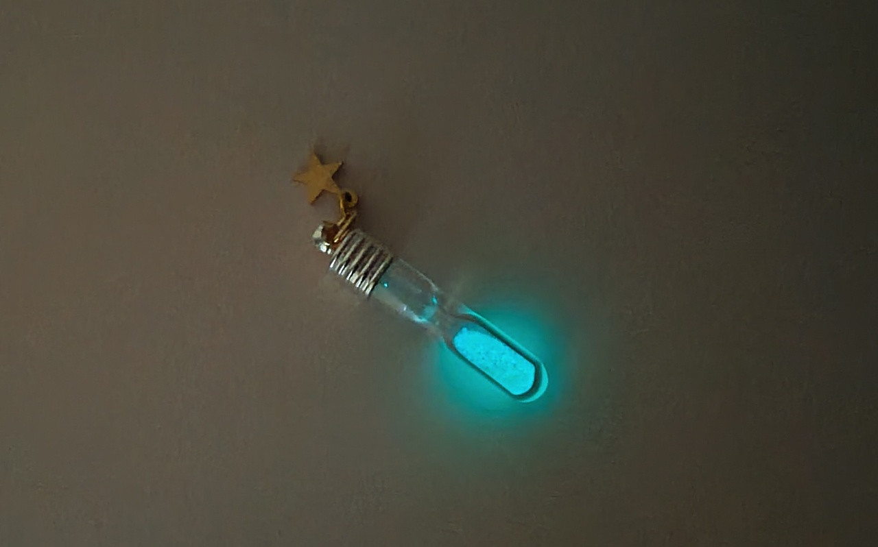 自然や人工の光で蓄光し暗闇でブルーグリーンに光ります。