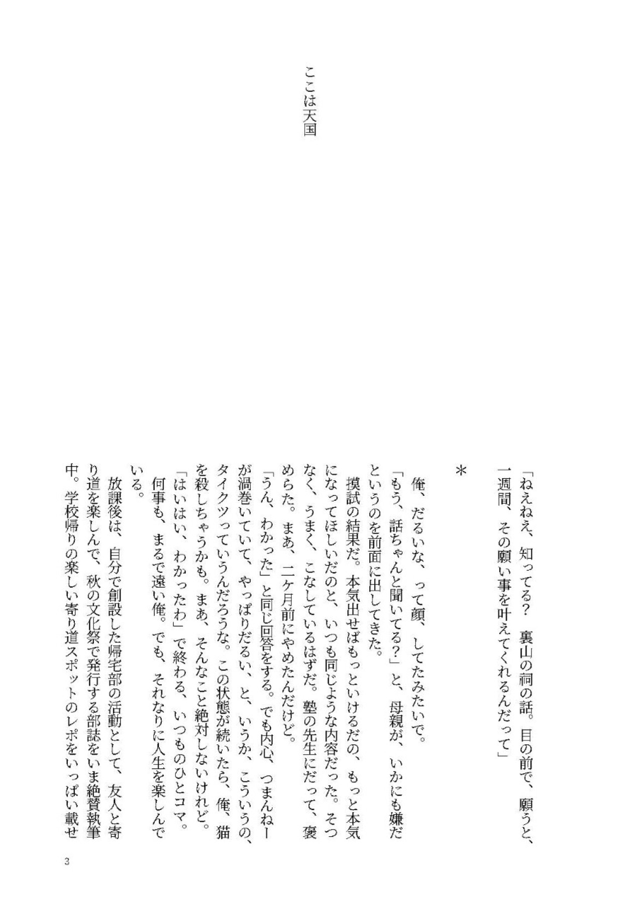 「ねえねえ、知ってる? 裏山の祠の話。目の前で、願うと、一週間、その願い事を叶えてくれるんだって」