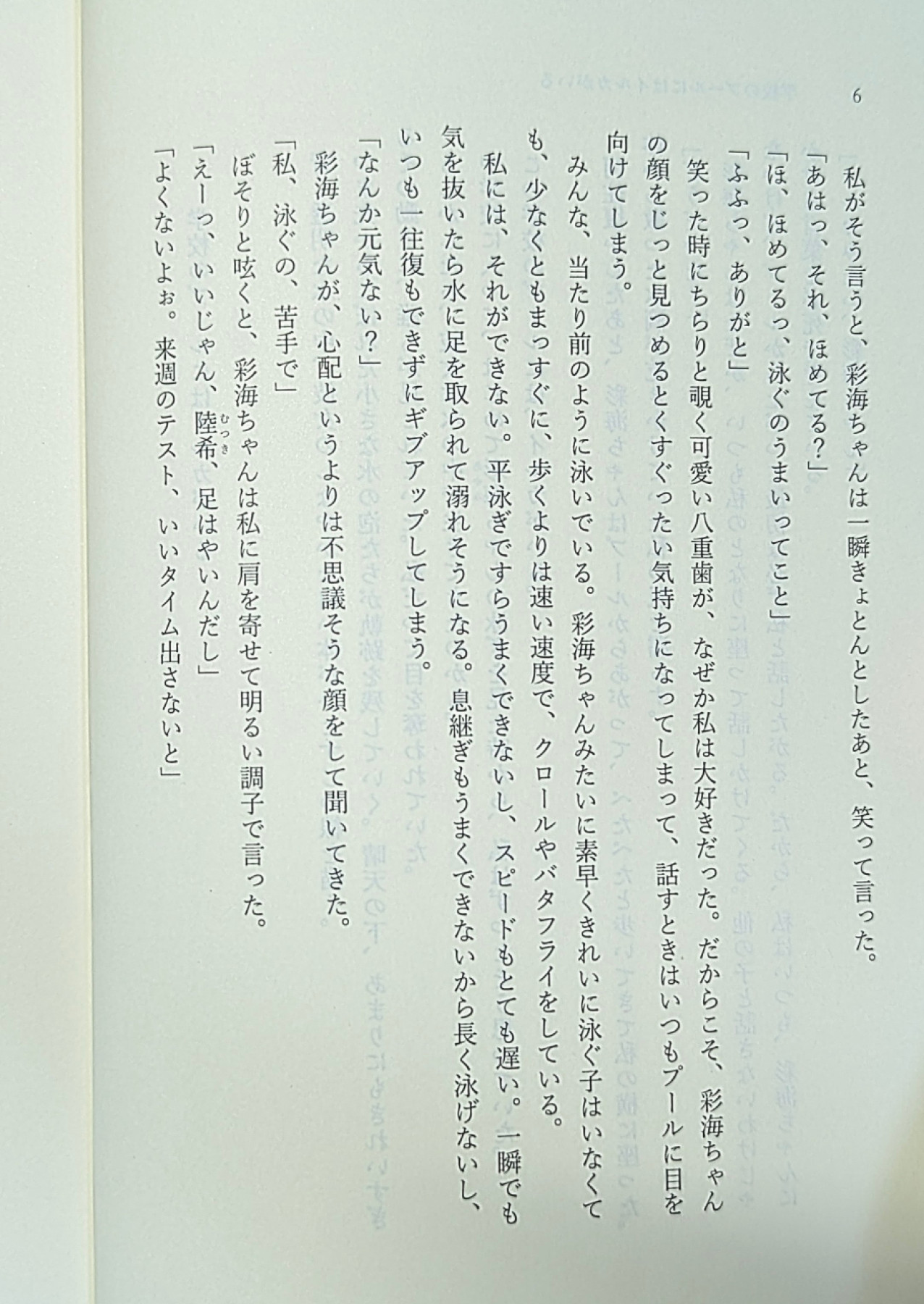 プールでうまく泳げず悩んでいた陸希(むつき)は、ひそかに憧れていた同級生の彩海(あやみ)から泳ぎ方指導の提案を受ける。泳げないもどかしさ。彩海と過ごす時間の楽しさ。複雑な感情を抱えながら、陸希は彩海への思いに向き合っていく。 プール、ペットボトルの水、海、雲、点滴。「水」から着想したキーワードをもとに綴った百合小説短編集。揺れ動く気持ちや迷う心、あるいは決意、希望を胸に抱く人たちを描いています。