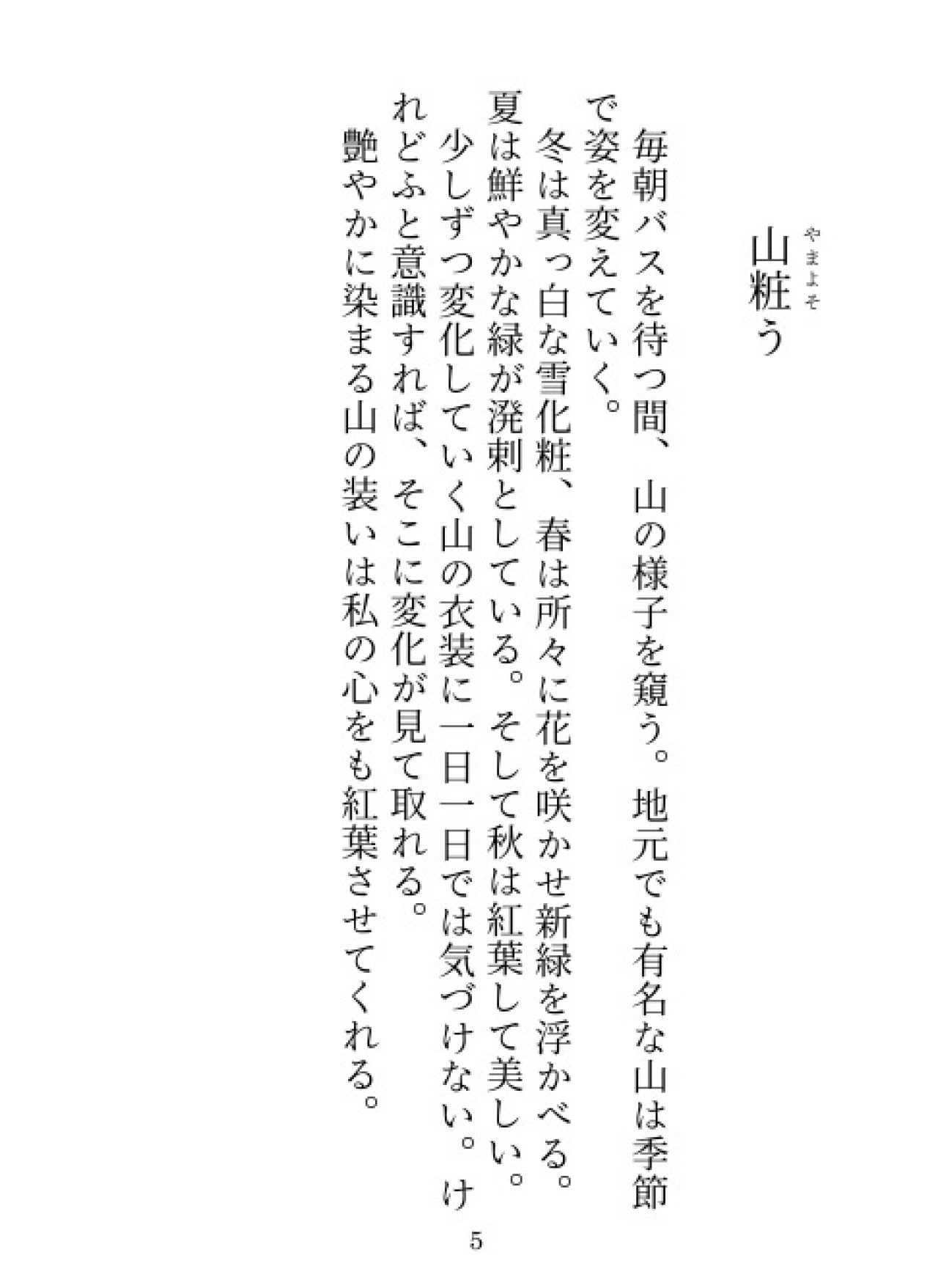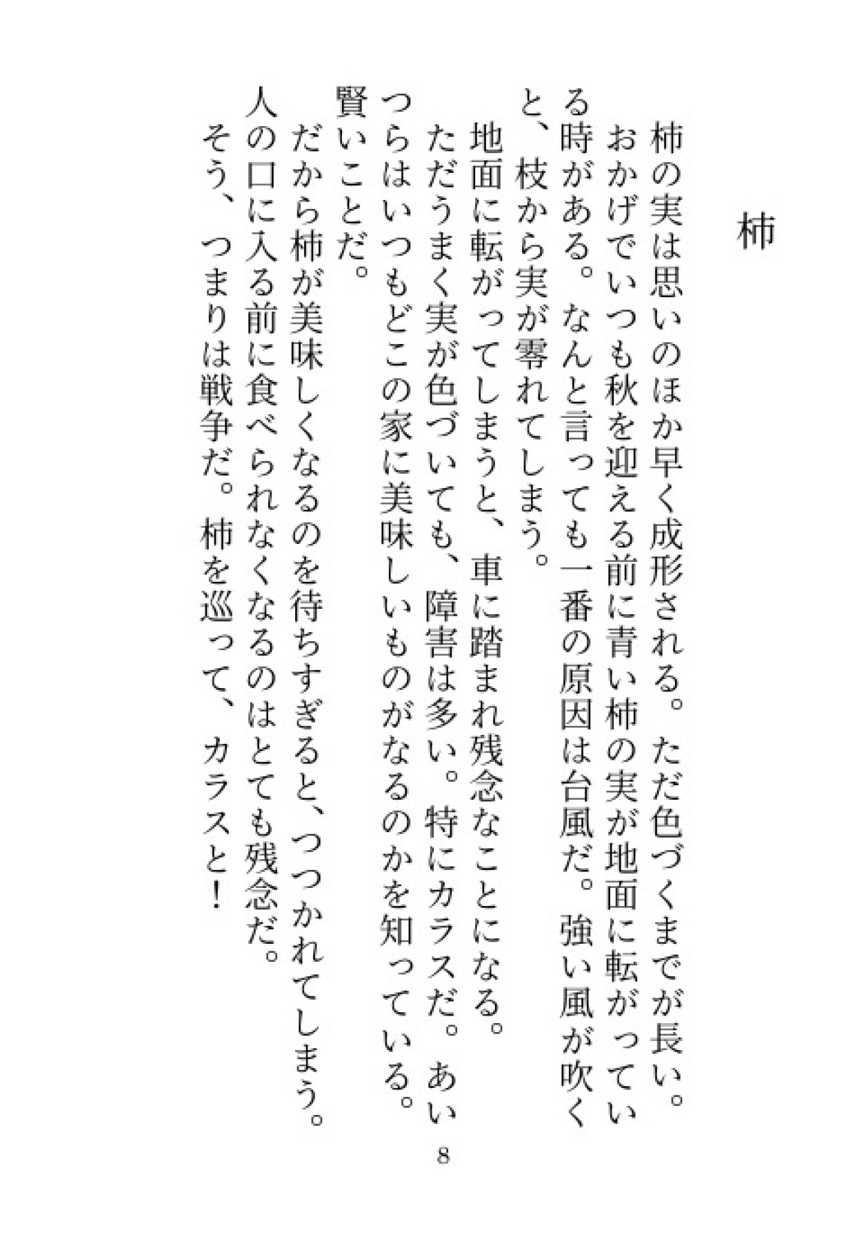 近年、夏が暑すぎて突然の冬が現れる。秋もあるはずなのにうまく感じ取れない。それが悔しくて書いた、秋お題のショートショート。 表紙は4パターンあるので、ランダムになります。