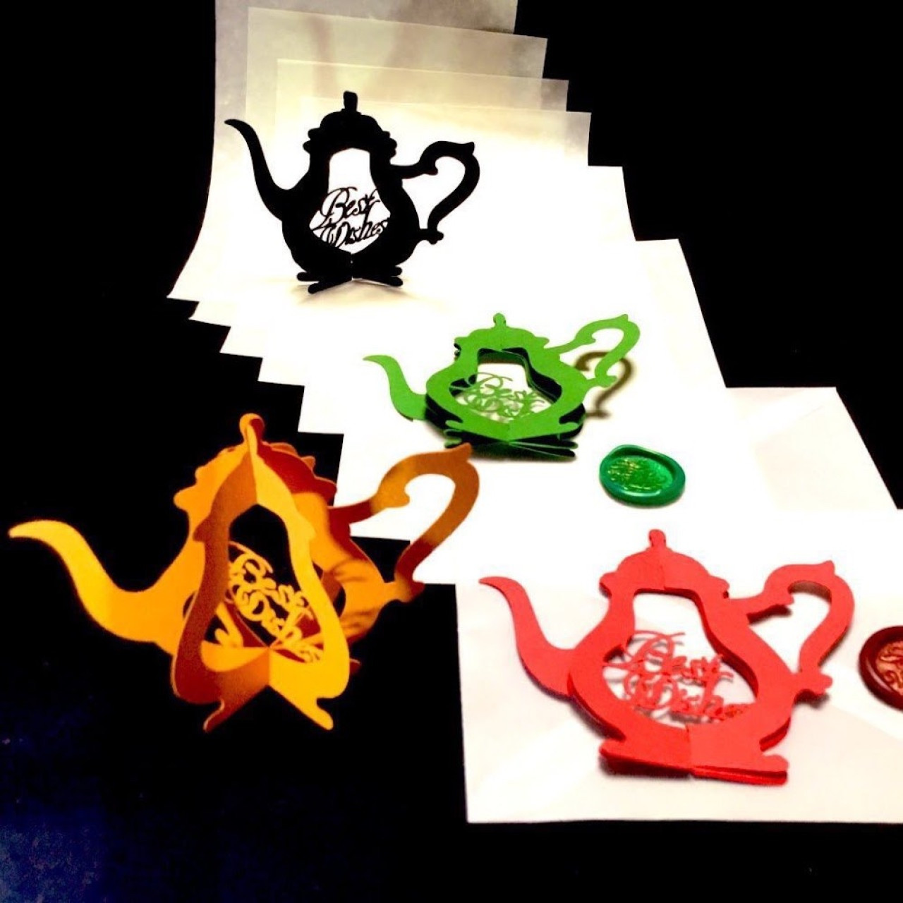 ティーポット型の自立して飾れる3Dポップアップカードです。