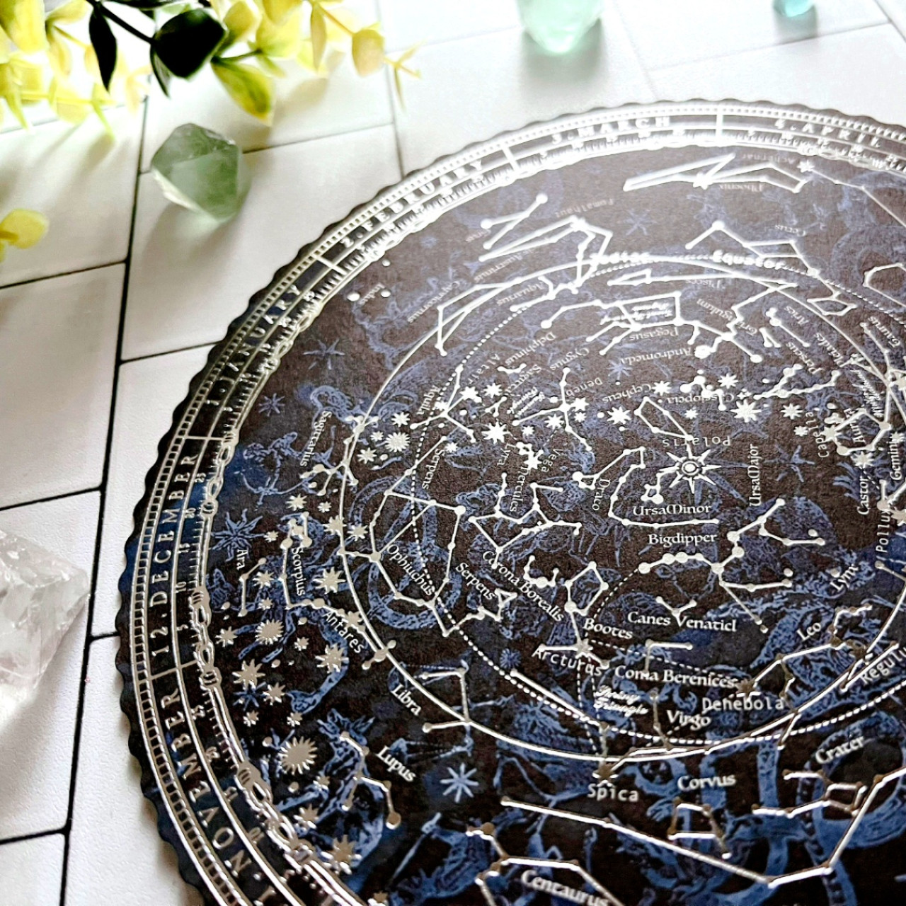 星座を写した星座盤は銀の箔押しを施し、春の大曲線・夏の大三角・秋の四辺形・冬のダイアモンドなどの春夏秋冬を代表する星空を描いています。