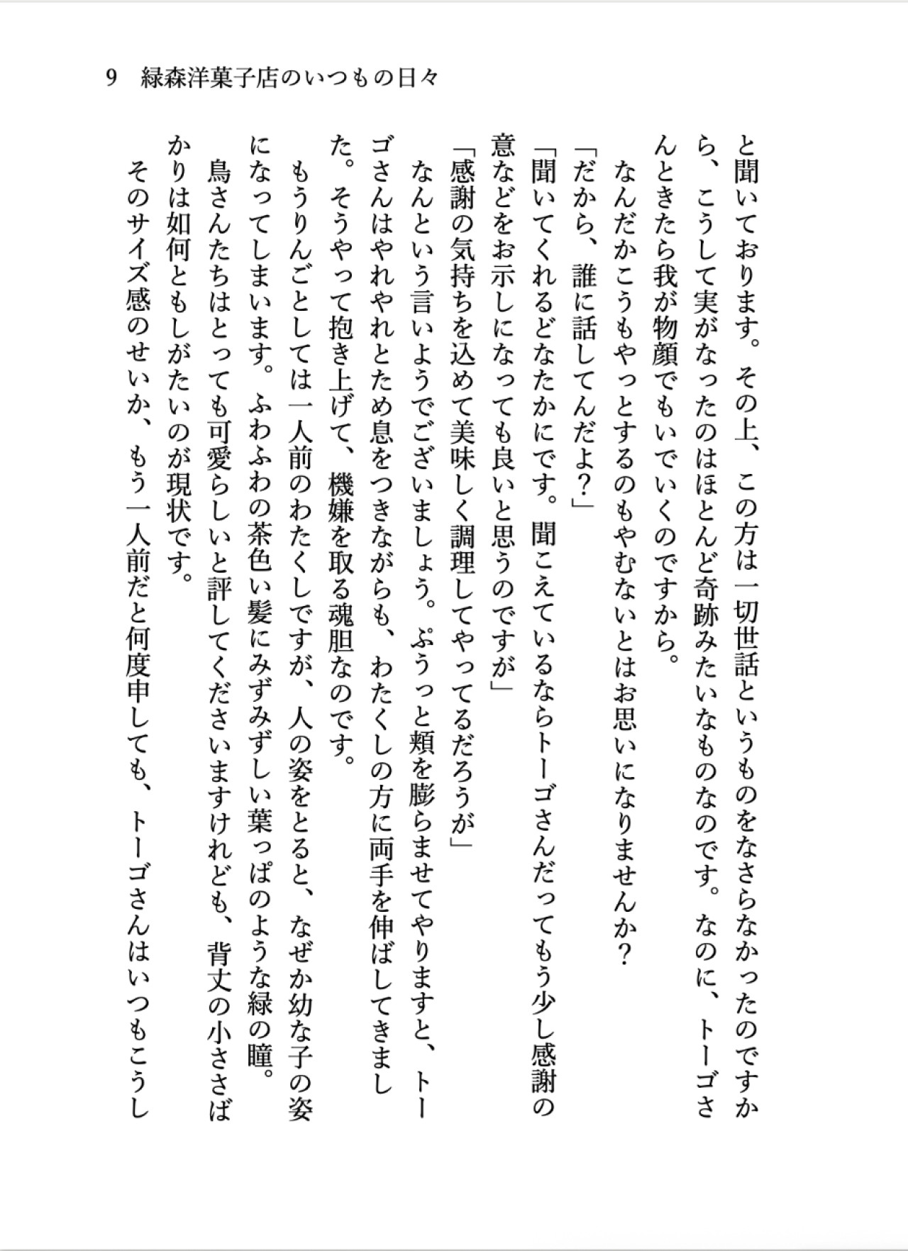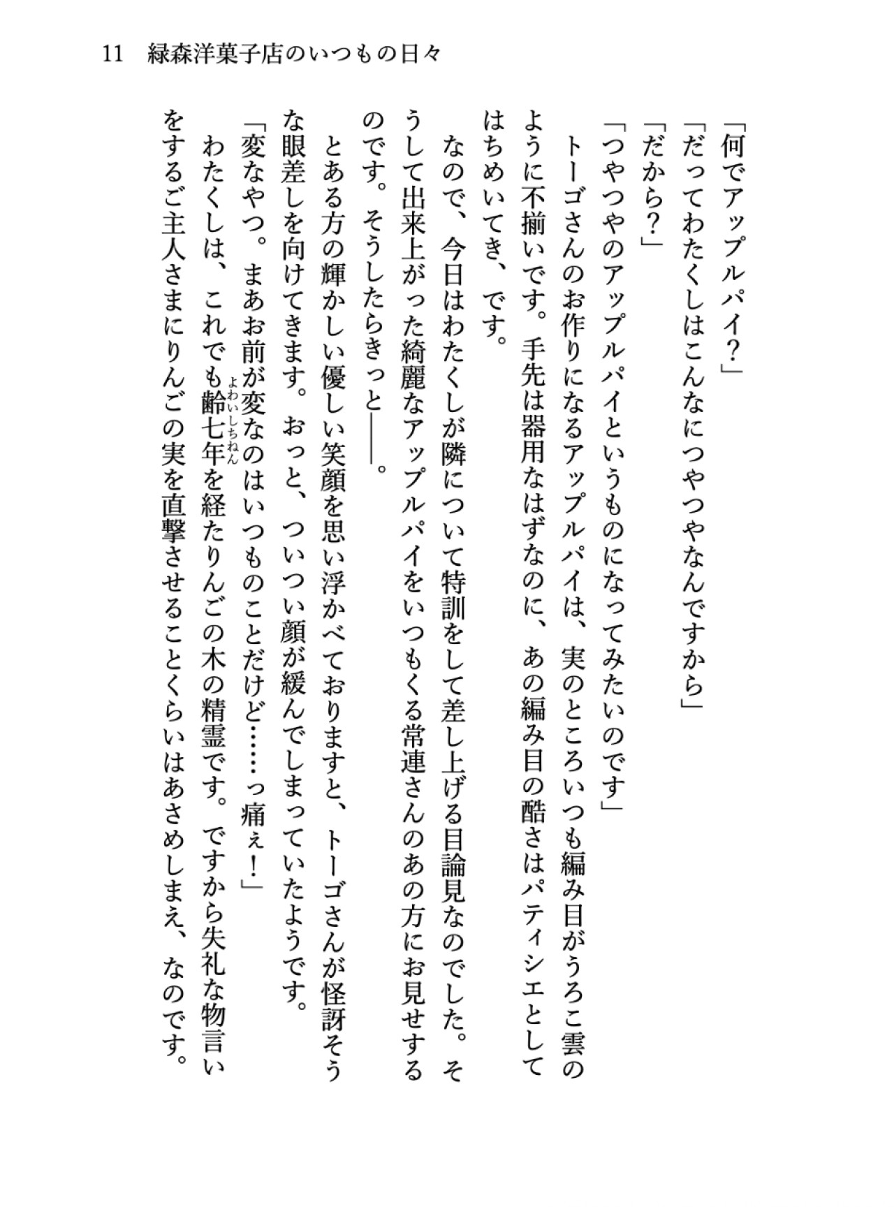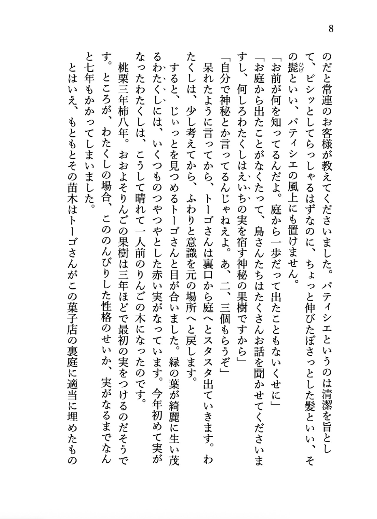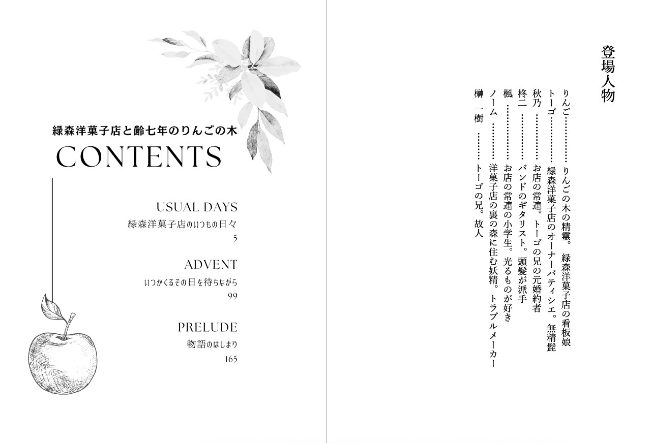 洋菓子店の裏庭に無造作に植えられたりんごの木。七年経ってようやく実をつけたのんびりやのその木には、緑の葉っぱのような瞳とふんわりやわらかな茶色の髪を持つ、小さな精霊が宿っていました。その店のオーナーパティシエの青年トーゴは、口も態度も品が良いとは言いがたいけれど、何やら彼女とは深い縁がありそうで……?