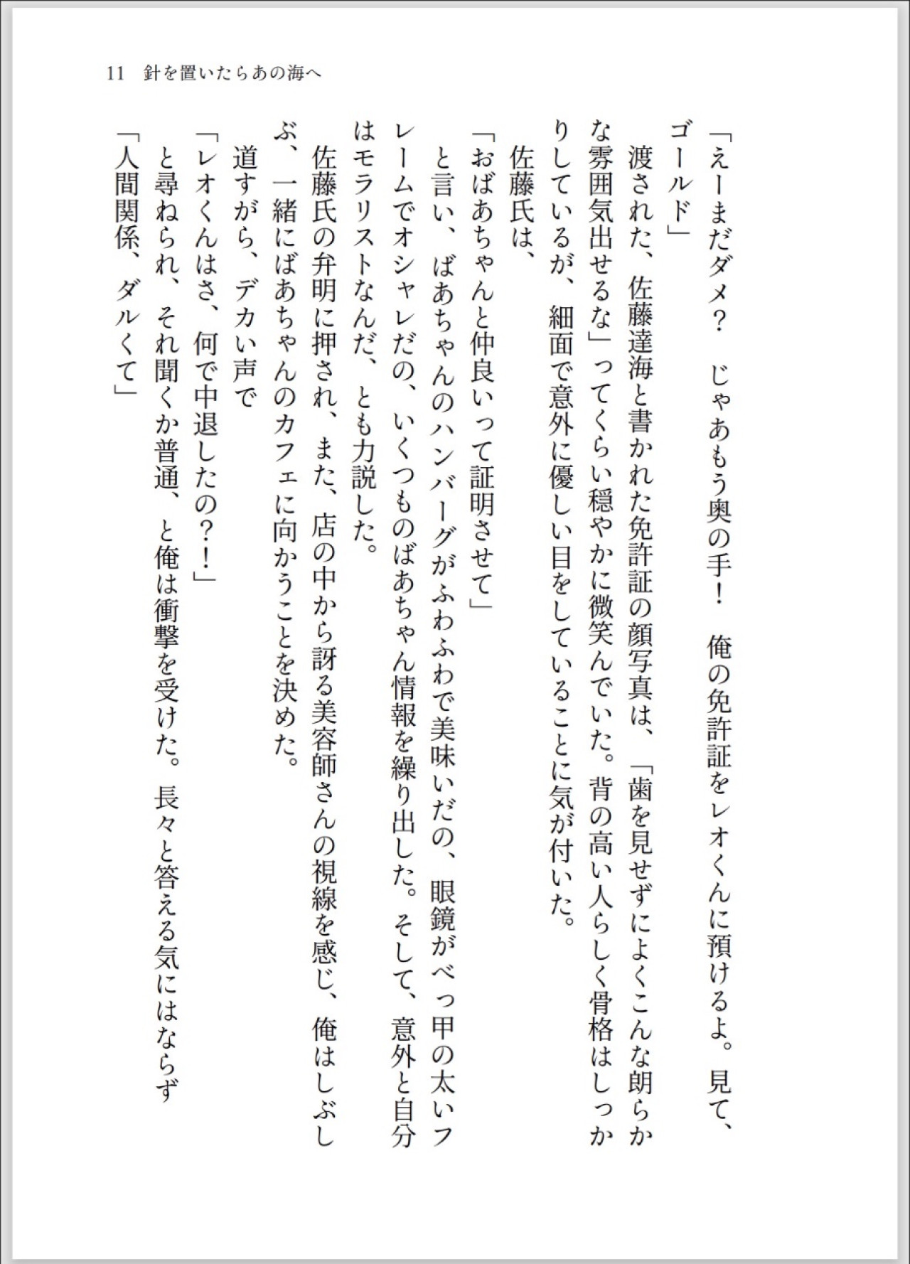 レオはカラフルな配色ニット「フェアアイル」を編みたいという夢があるが、色覚特性のため諦めていた。それを知ったたっちゃんさんは、「目を貸す」と申し出て、一緒にニットを編み、タトゥー図案を作るバディとなる。徐々に絆を深めるふたりは、それぞれの苦しみに区切りを付けるため、関門海峡を歩いて渡る旅に出る。