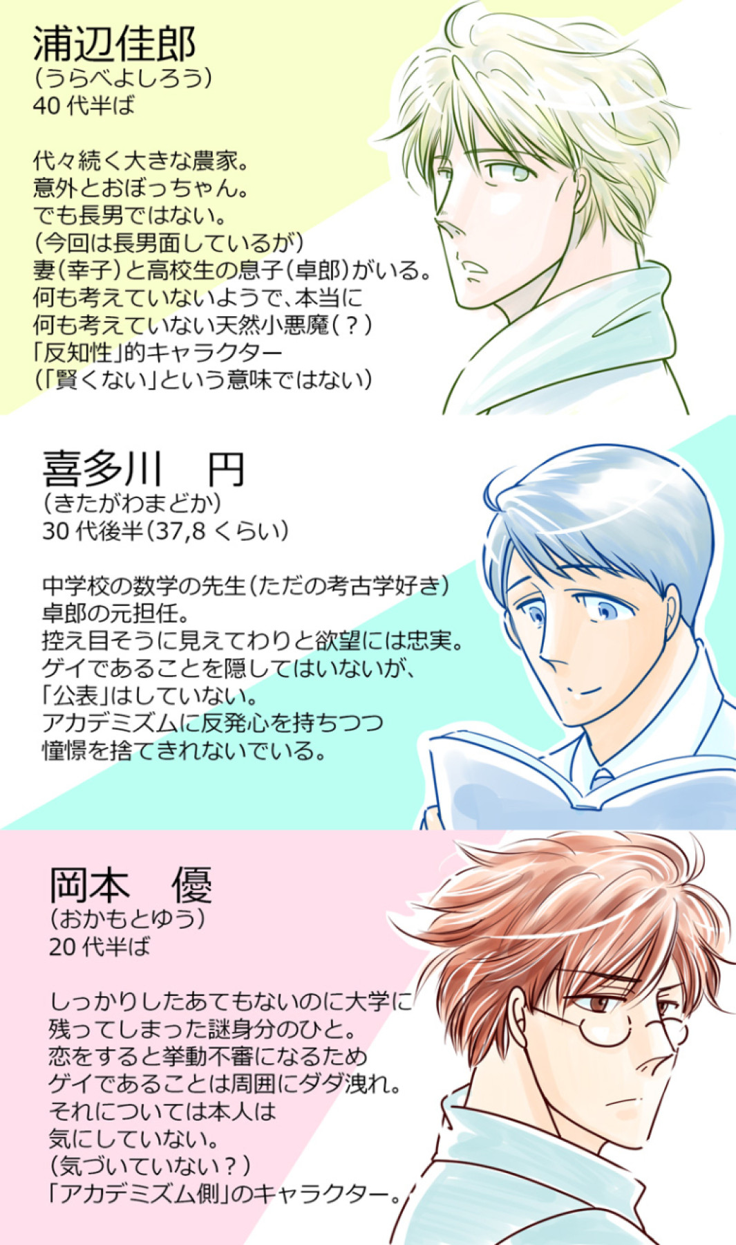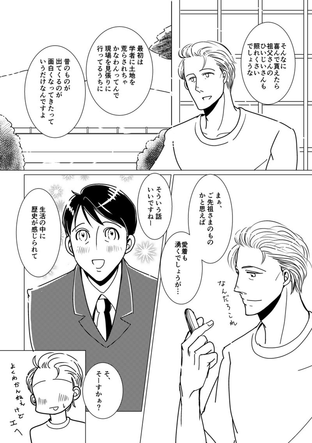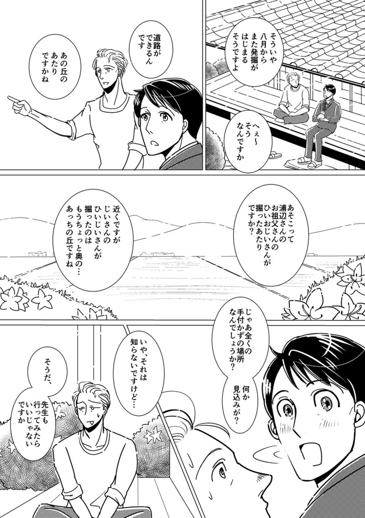 農家のおじさんとおじさんの息子の元担任の先生と、おじさんの家の近所で発掘作業をしている若い考古学者の三角関係、ほのぼの不倫コメディです。読切。