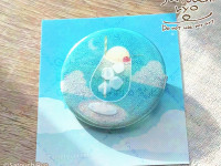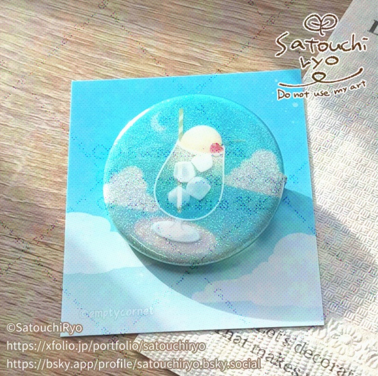 クリームソーダと空のデザインに、キラキラのラメが輝く缶バッジです