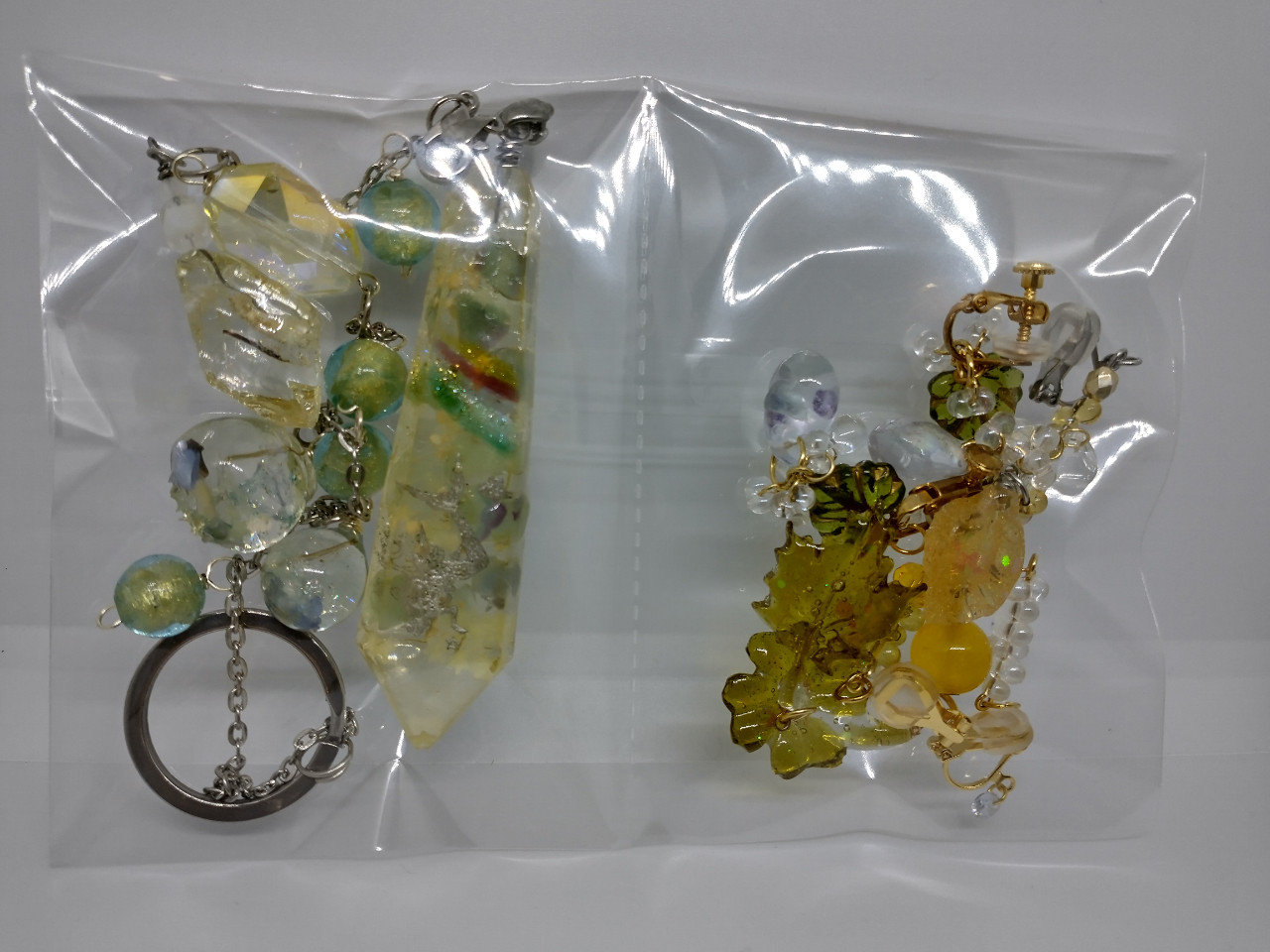 お得な見える福袋タイプの作品です。 写真の作品がセットになっております。 モビール1点、付け替えイヤリング金具とチャームのセット、イヤリング1セット、アシンメトリーイヤリング1点