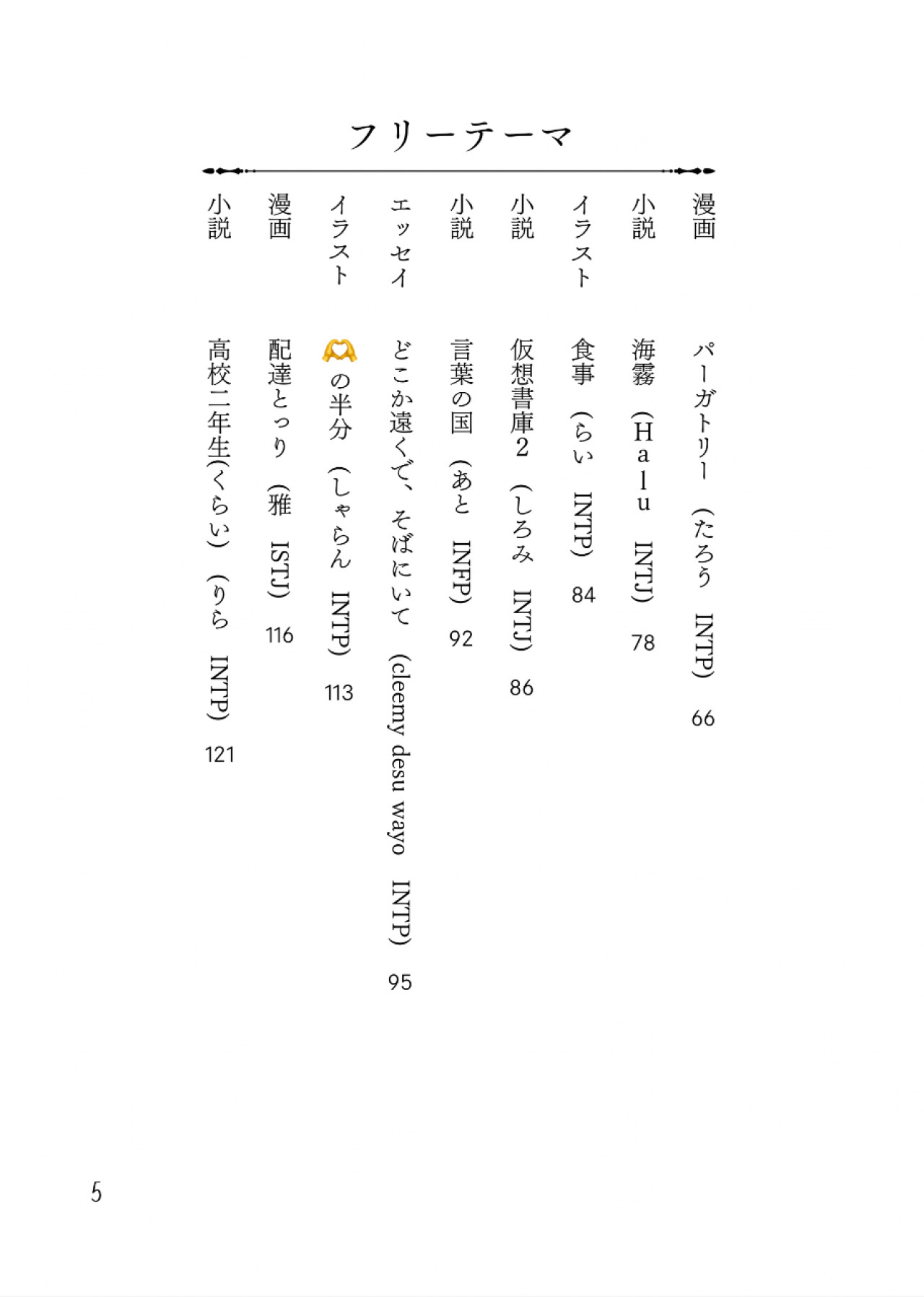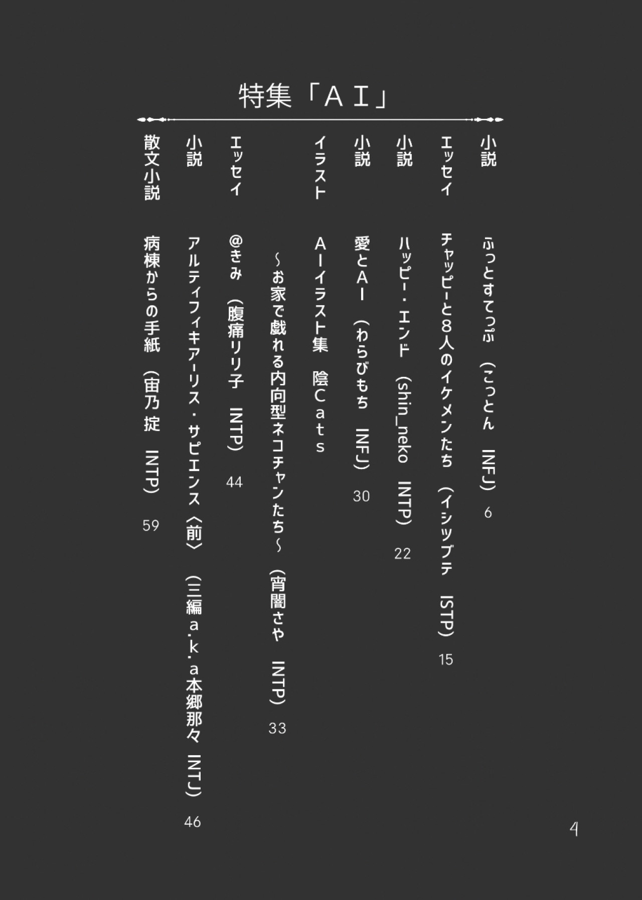 Xの片隅にある「類型界隈」の内向型自認の有志17人による文芸誌。 小説、エッセイ、イラスト、写真なんでもあり。 A5サイズ132ページ 表紙:ホロPP加工 遊び紙:カラートレペ 本文用紙:上質紙(白色)