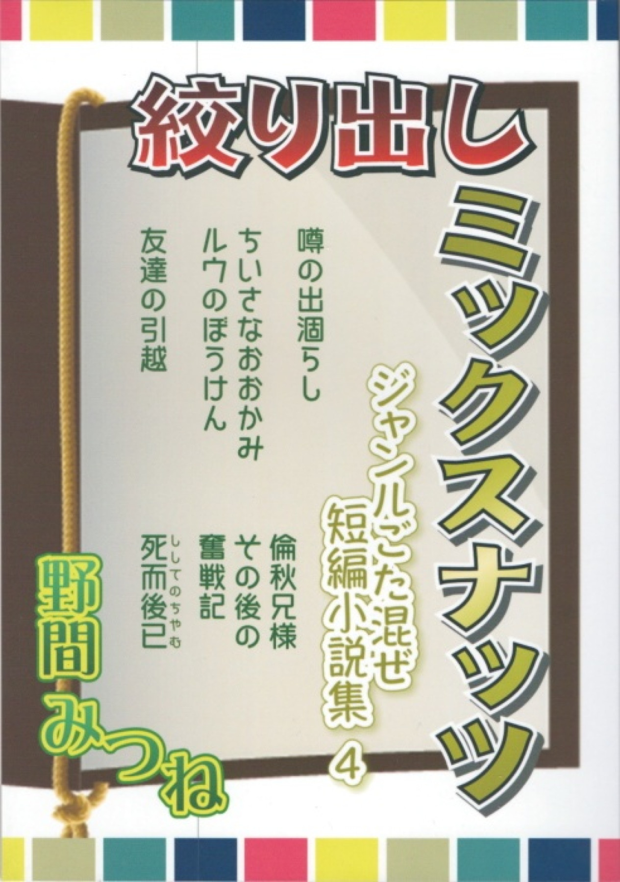 野間みつねが過去に何処かで個別に発表したりしなかったりの、しかも単行本に纏められる当てのなかった小品を、ジャンルごた混ぜで採録した短編集。二次創作モノも混在。