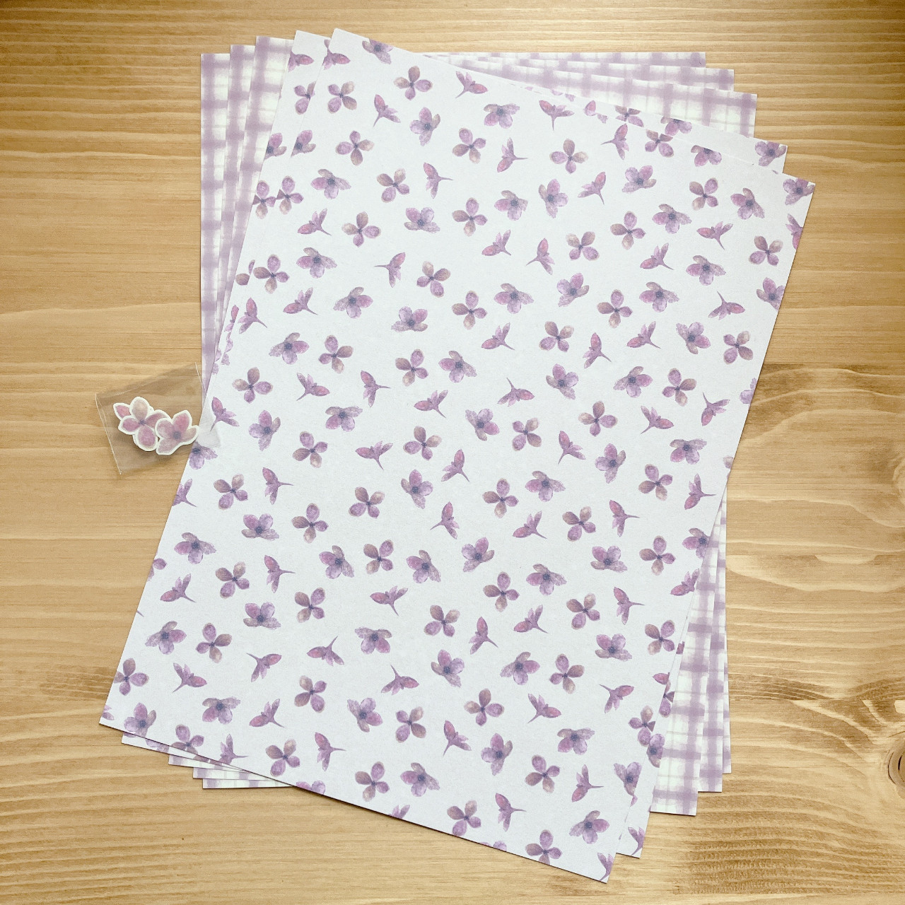 ライラックの花柄と、チェック柄の2種類のデザインペーパーです。
