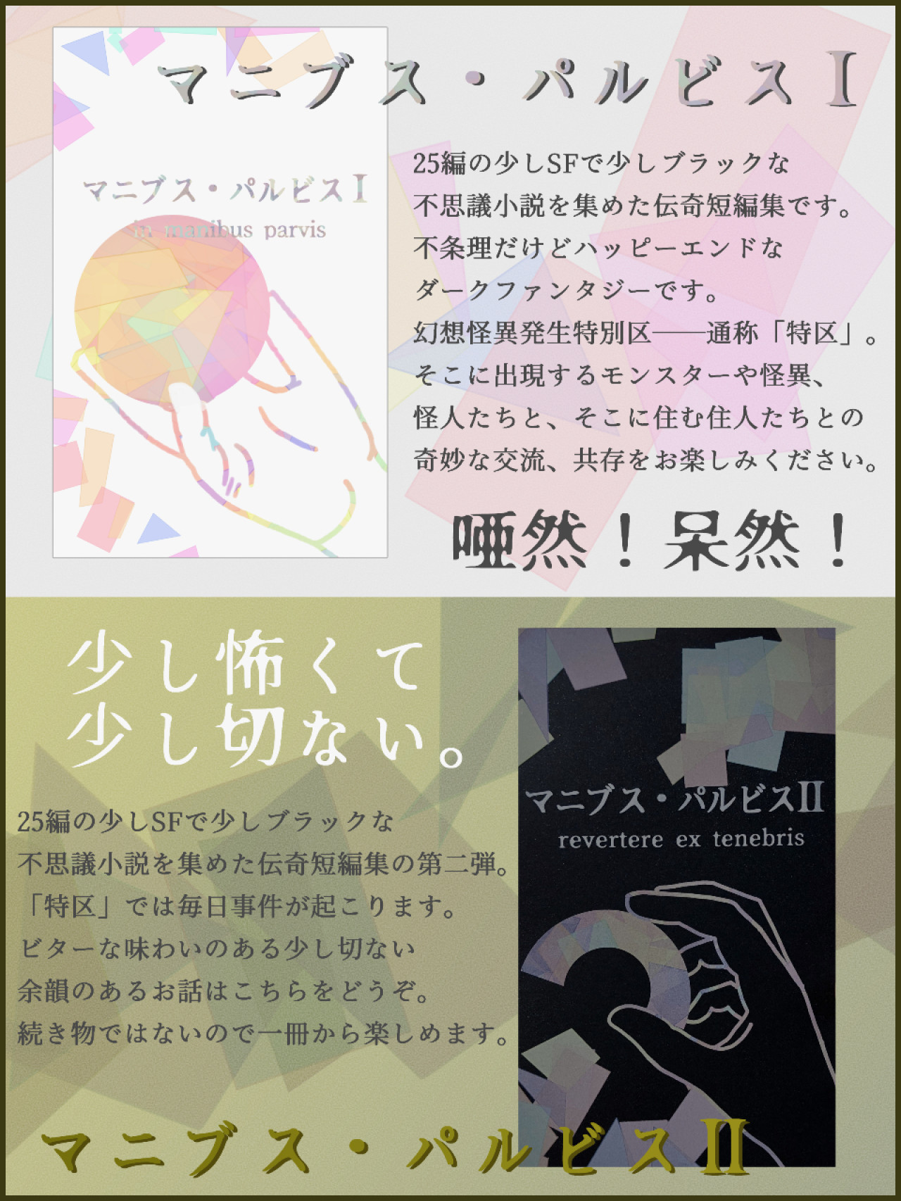 架空ストアさんに並ぶまでの期間はBOOTHに電子版を置いておきます(『3Plogy∞Fes』を除く)。PDFです、EPUBは何故かうまいこといきませんでした。質量を伴っていないぶん、ちょっとお安くなっています。