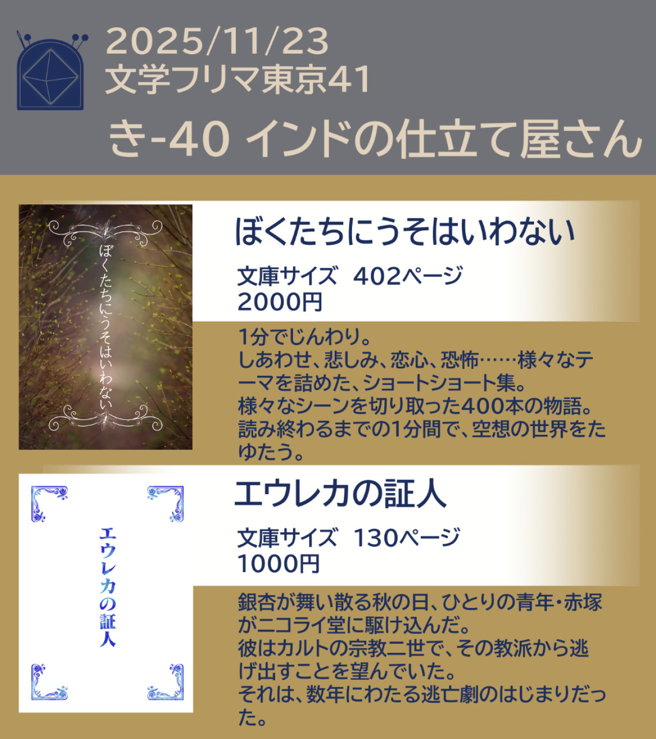 11/23(日)に東京ビッグサイトにて開催する、文学フリマ東京41に「夜灯舎」という個人サークルで参加します。ブースは【き-74】(南3-4ホール)です。