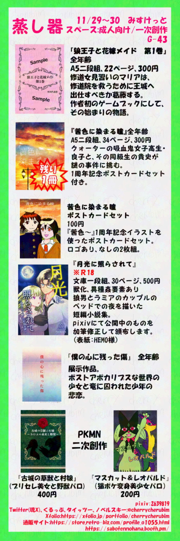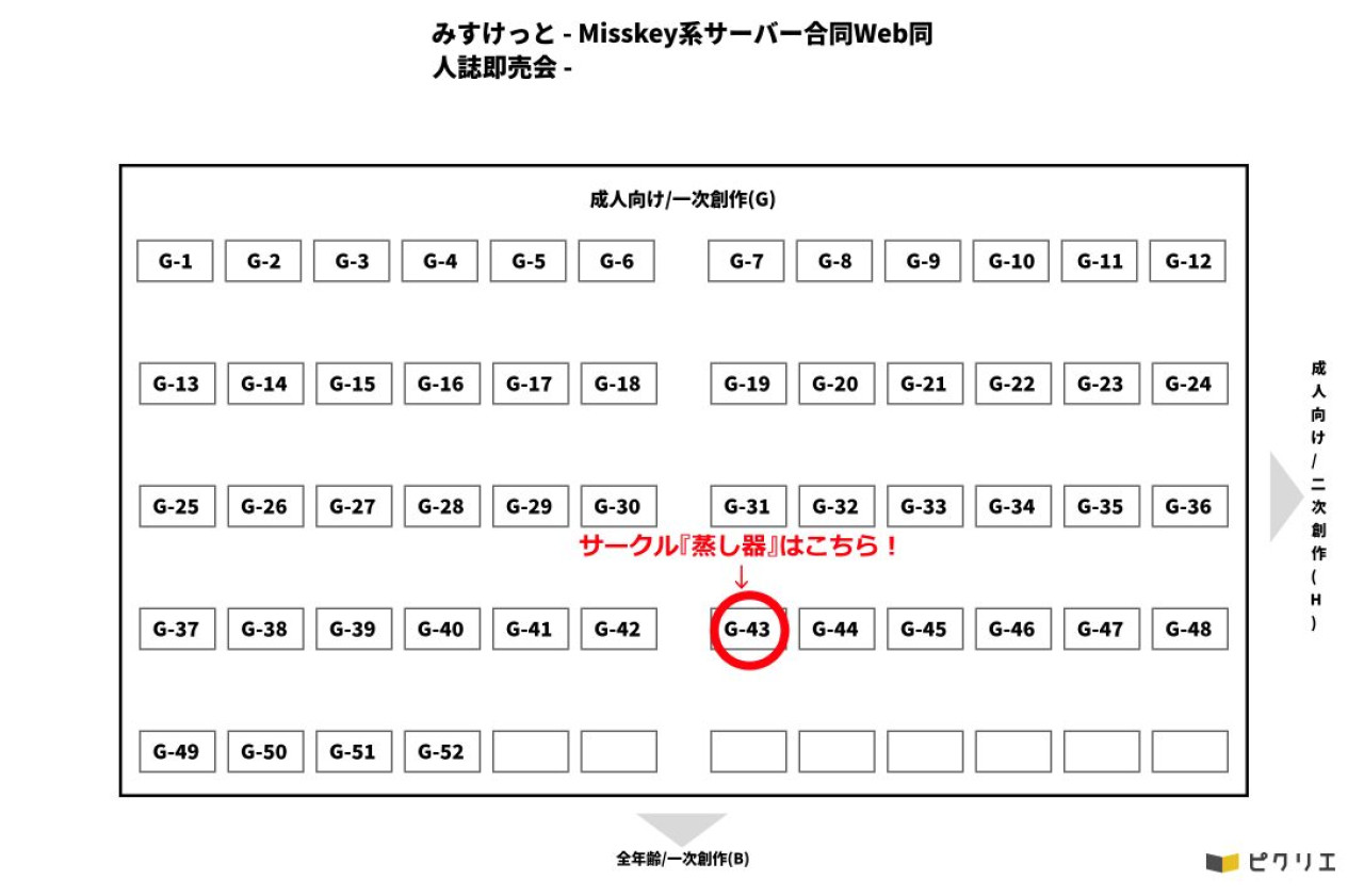 11/29〜30にピクリエで開催されるイベント『みすけっと』のお品書きと配置図です。 配置は「成人向け/一次創作(G)」の「G-43」です。 会場URL↓ https://picrea.jp/event/c630fa554a3327d2a262e8705178781847b4d64a421fb94362214e718c4fb578